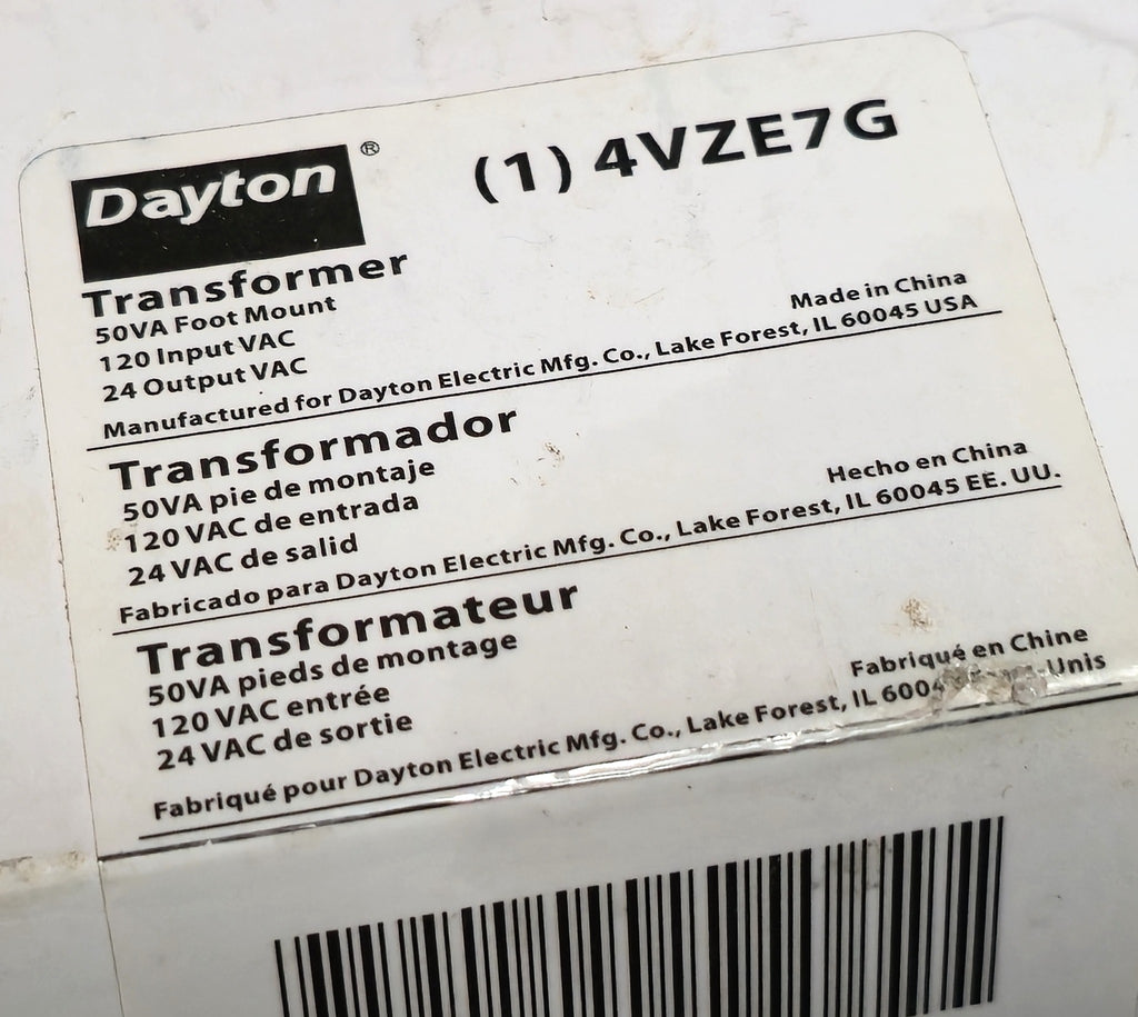 Dayton 4VZE7G Control Transformer Pri:120VAC Sec: 24VAC 50VA Foot Mount - New