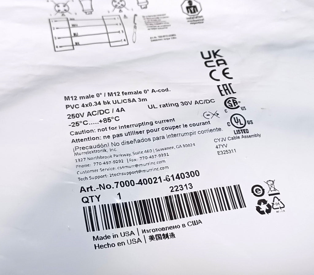 Murr 7000-40021-6140300 M12 Male - M12 Female Straight 4-Pin Sensor Cable - New